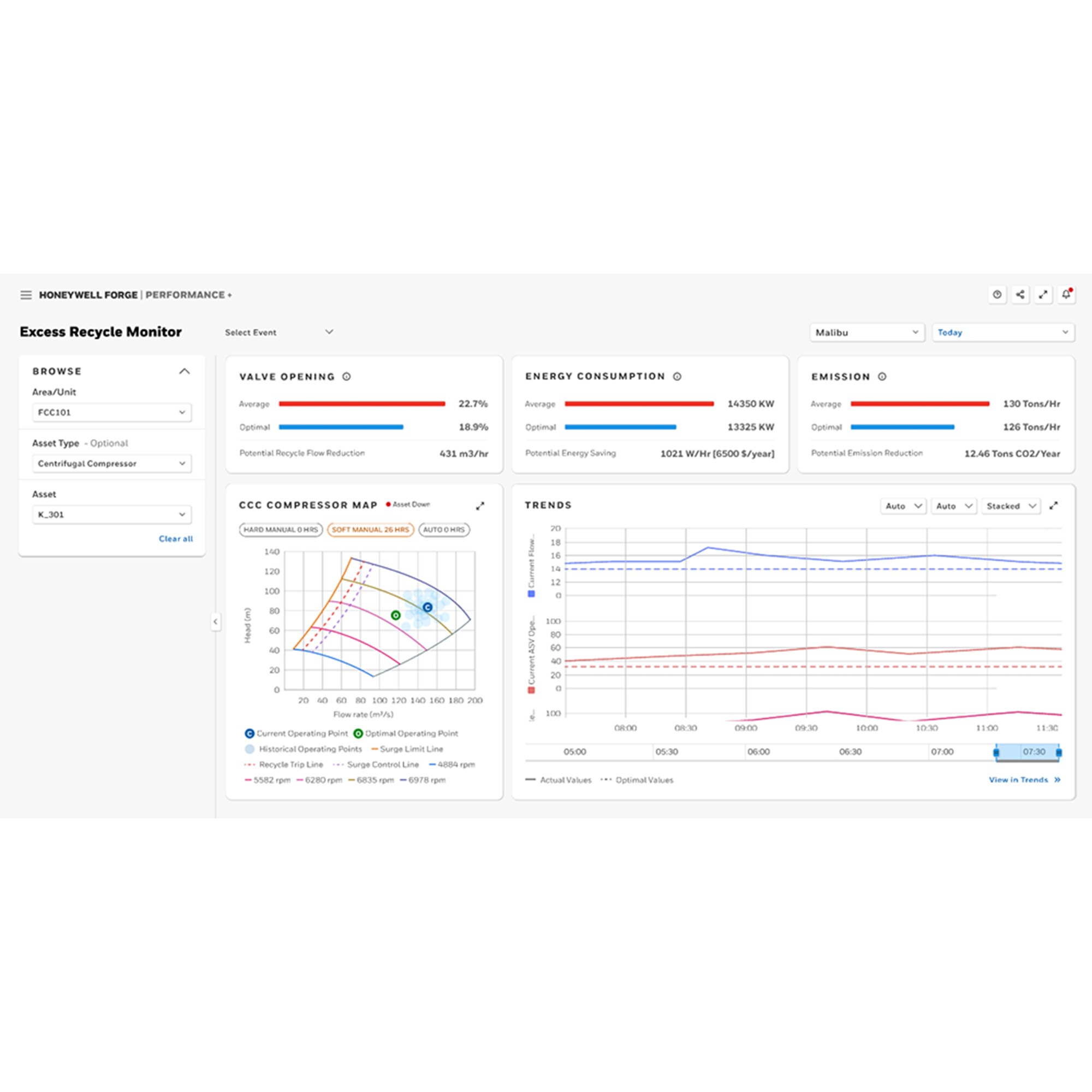 Estimation of excess emissions and reduction of carbon footprint through optimized antisurge valve operation.